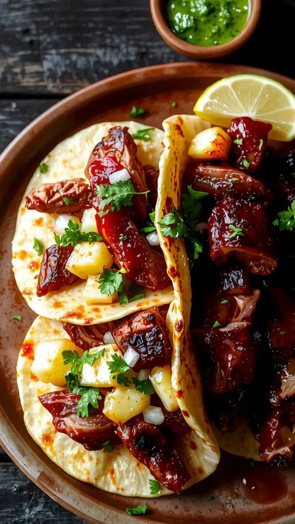 When it comes to plating techniques, I always stack the meat vertically on your trompo, ensuring each layer slightly overlaps for that authentic presentation.