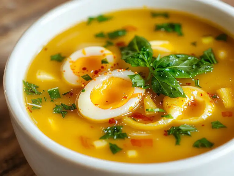 • Create the egg ribbons: Slowly pour the whisked eggs into the simmering broth in a thin stream while gently stirring the soup in one direction. This technique guarantees delicate, silky egg strands rather than clumps.