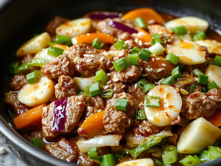 – Season and Simmer****: Pour in soy sauce and sesame oil, stirring to coat everything evenly. Let the mixture simmer for 2-3 minutes to allow the flavors to meld.
