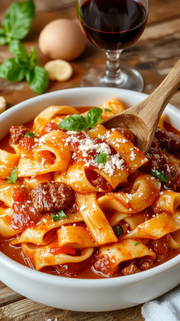 When serving, I recommend using proper plating techniques: twirl the pasta first, then ladle the sauce over the center, and finish with freshly grated Parmigiano-Reggiano.