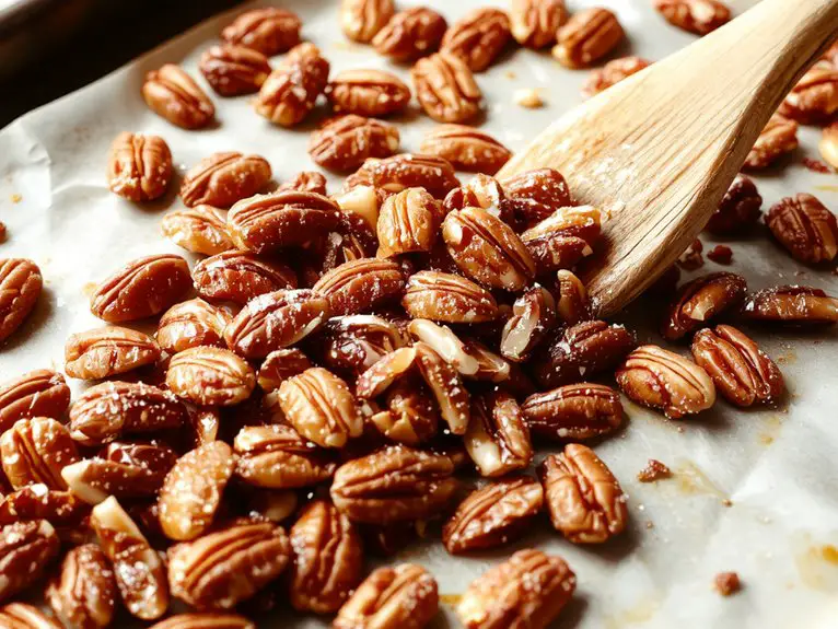 Bake for 45 minutes, stirring every 15 minutes to guarantee even cooking. This prevents the pecans from burning and helps them crisp up uniformly. Keep an eye on them during the last 10 minutes to avoid over-browning.